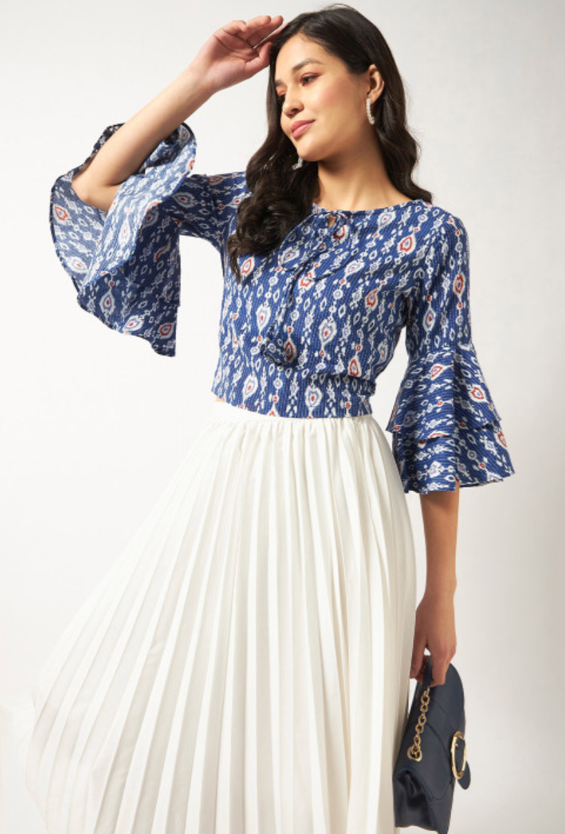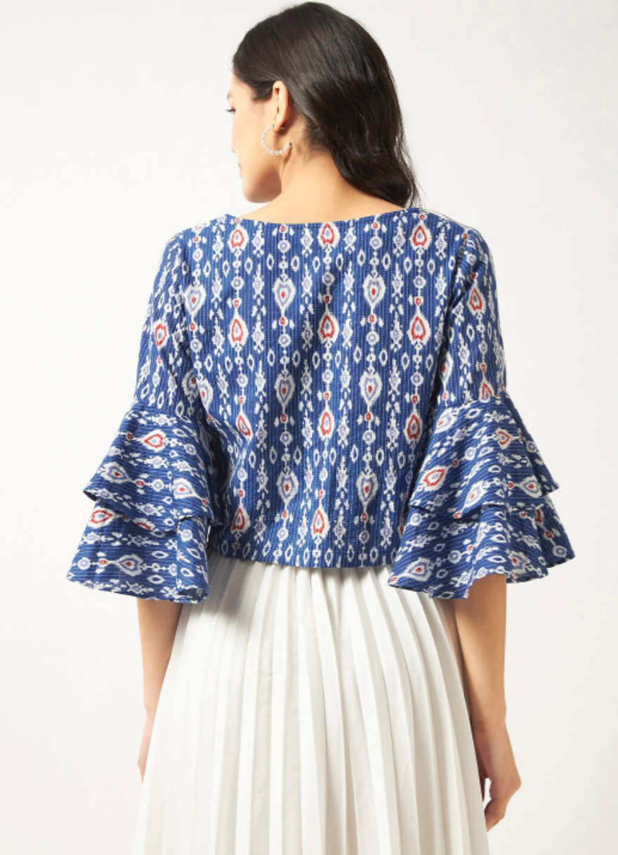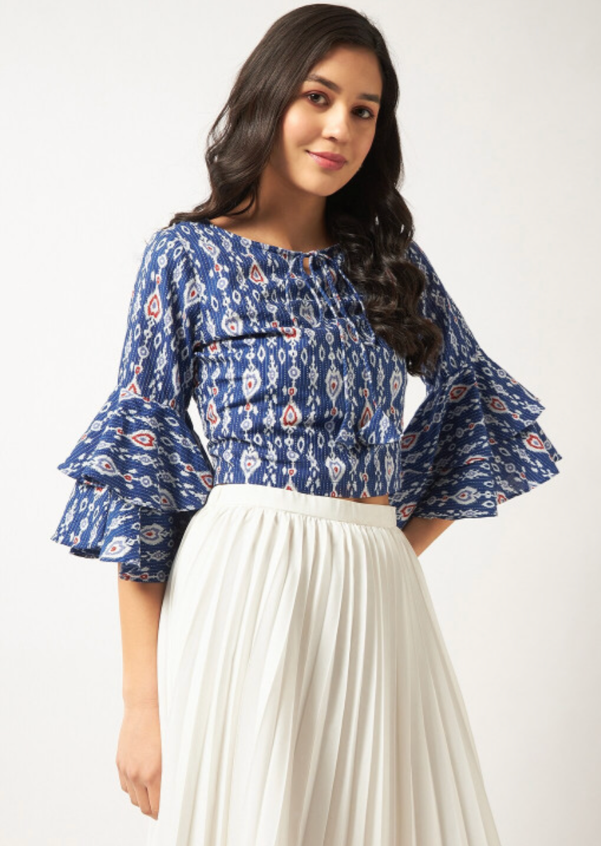 Blue regular top with floral print, round neck, three-quarter bell sleeves, and woven cotton fabric.