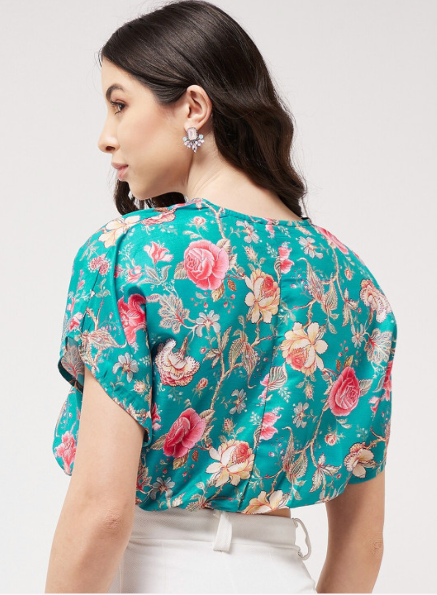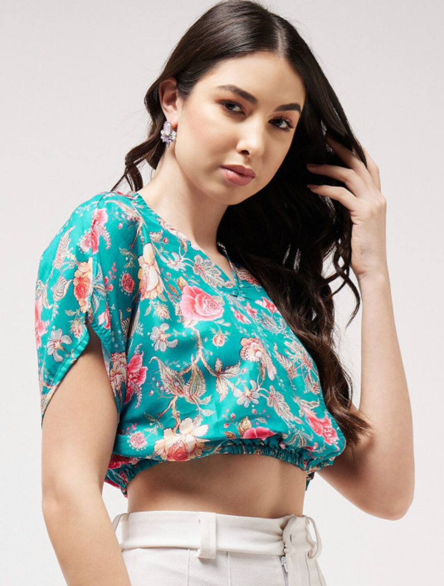 Blue floral printed crop blouson top with a V-neck, short extended sleeves, and woven fabric.