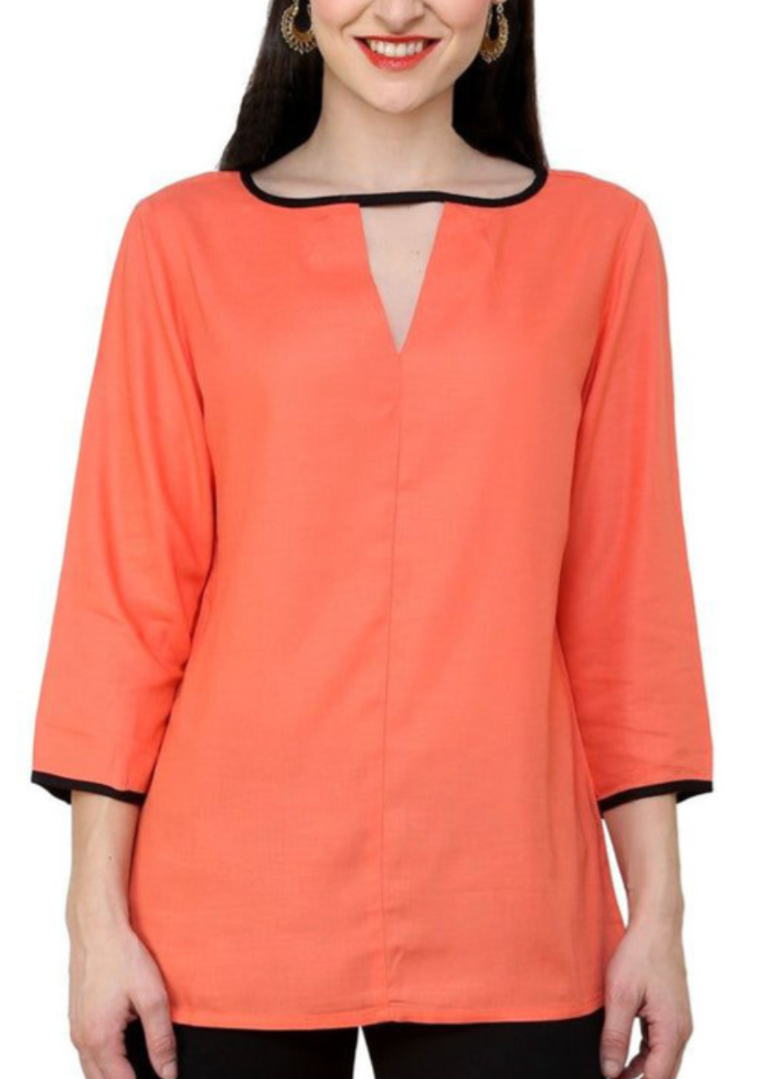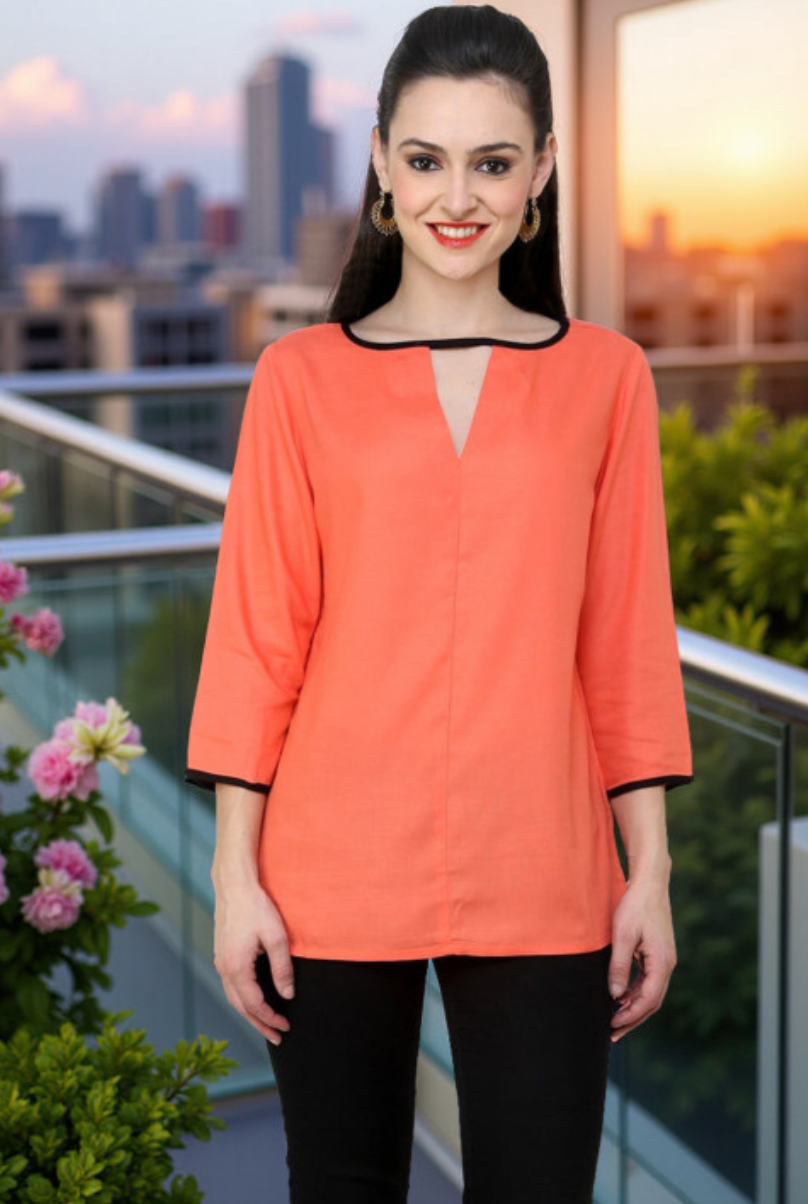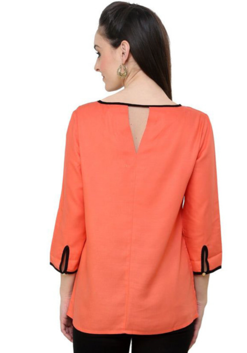 Coral regular solid top with a keyhole neck, three-quarter roll-up sleeves, detail, woven fabric, and closure.