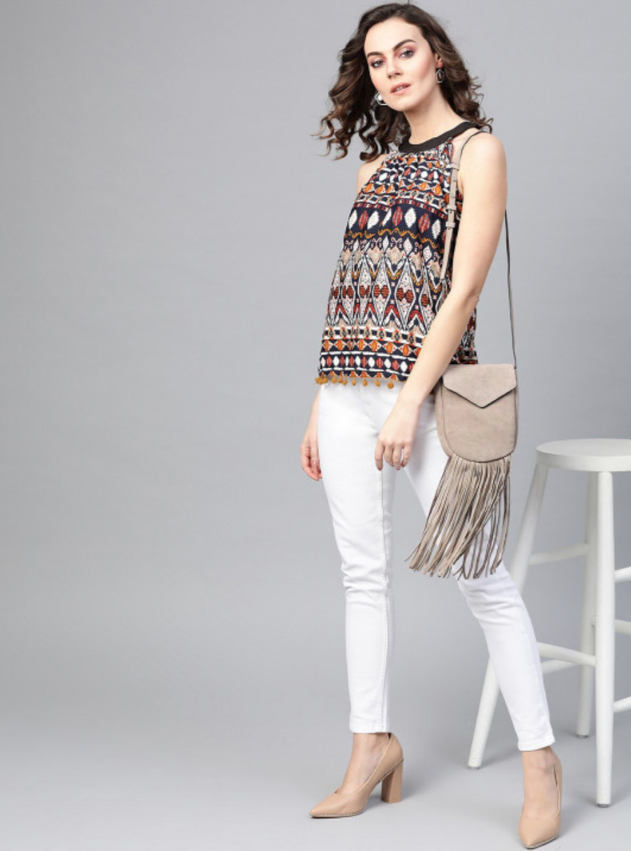 Multicoloured Geometric Print Halter Neck Crepe Top