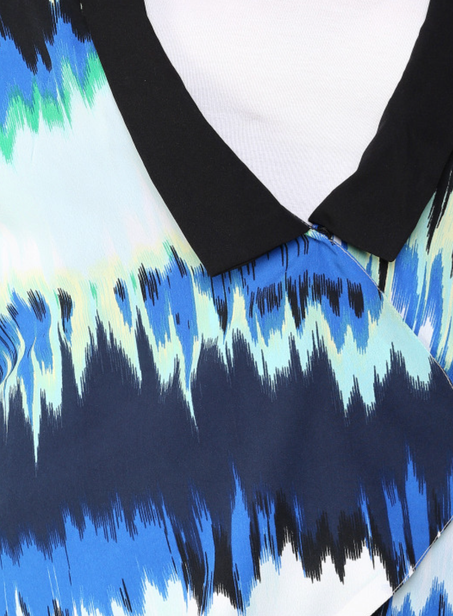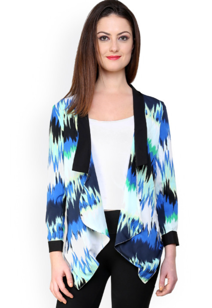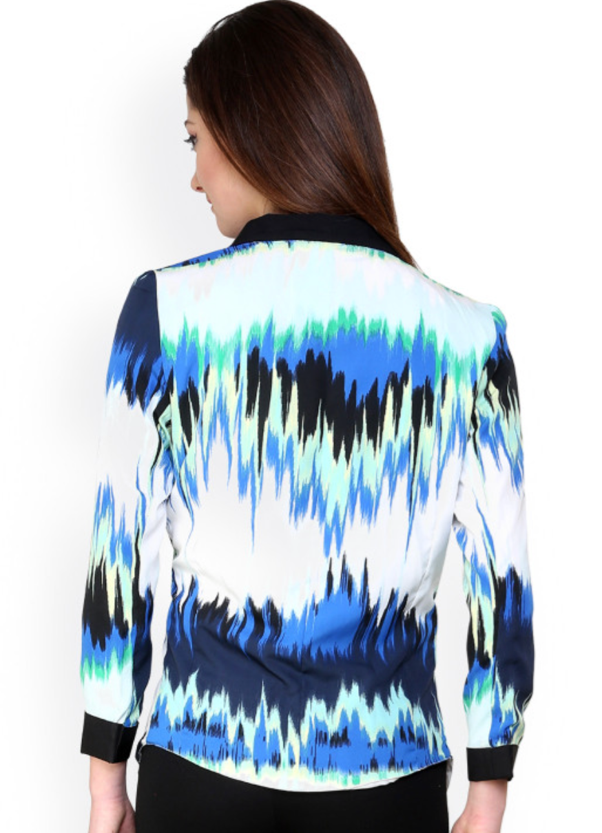 Multicoloured printed blazer, has a shawl collar with snap button closure on the front, long sleeves, and dipped hem