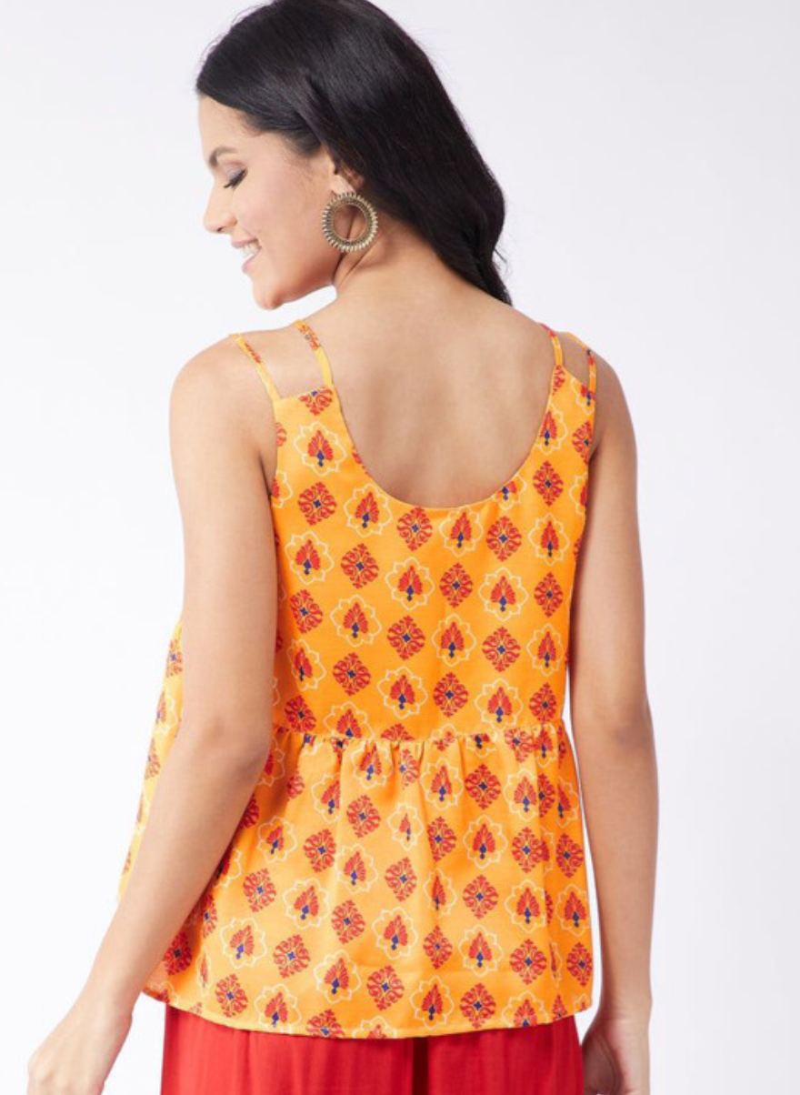 Yellow regular A-line top with ethnic motifs print, round neck, sleeveless design, and woven fabric.