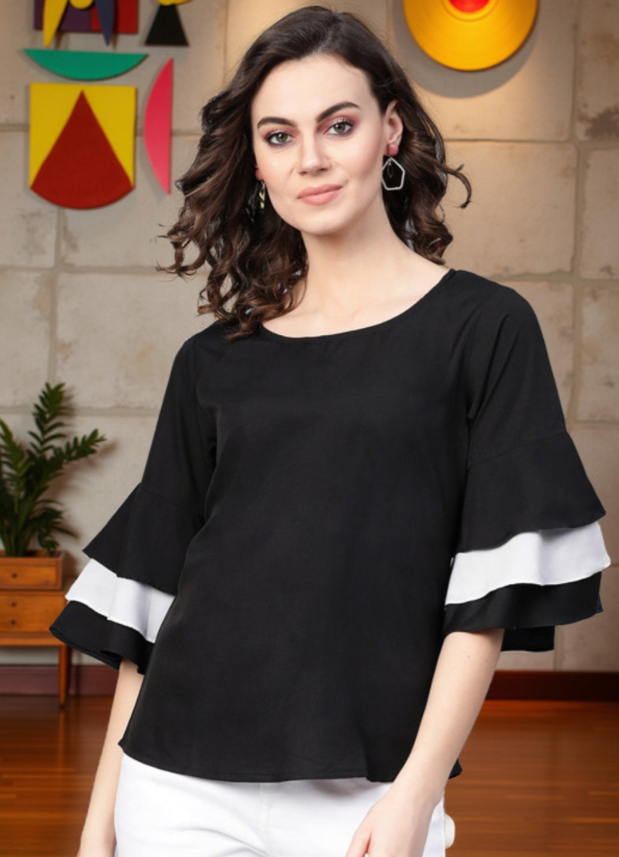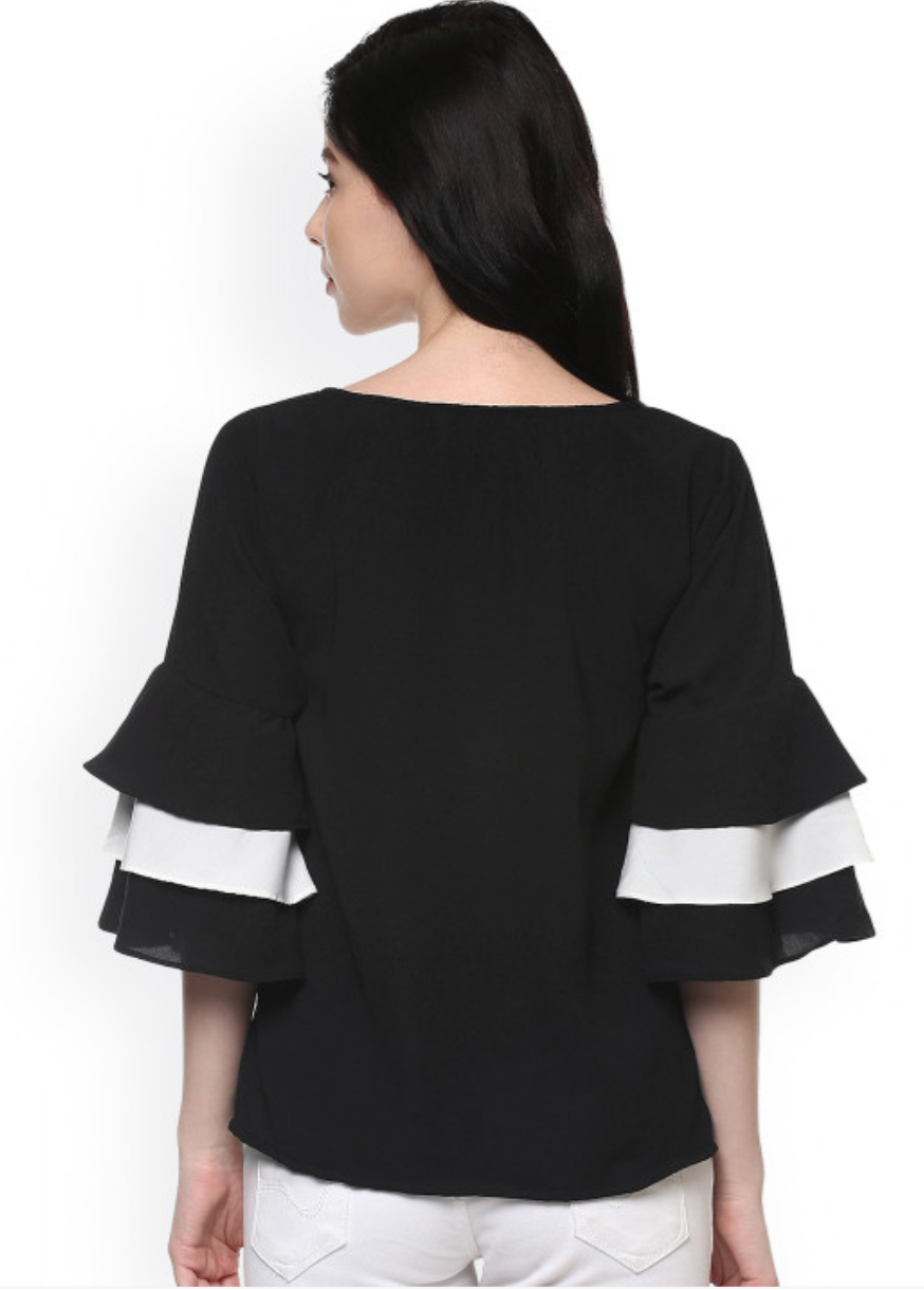Black and white solid woven regular top, has a round neck, three-quarter bell sleeves