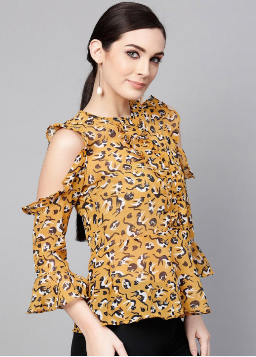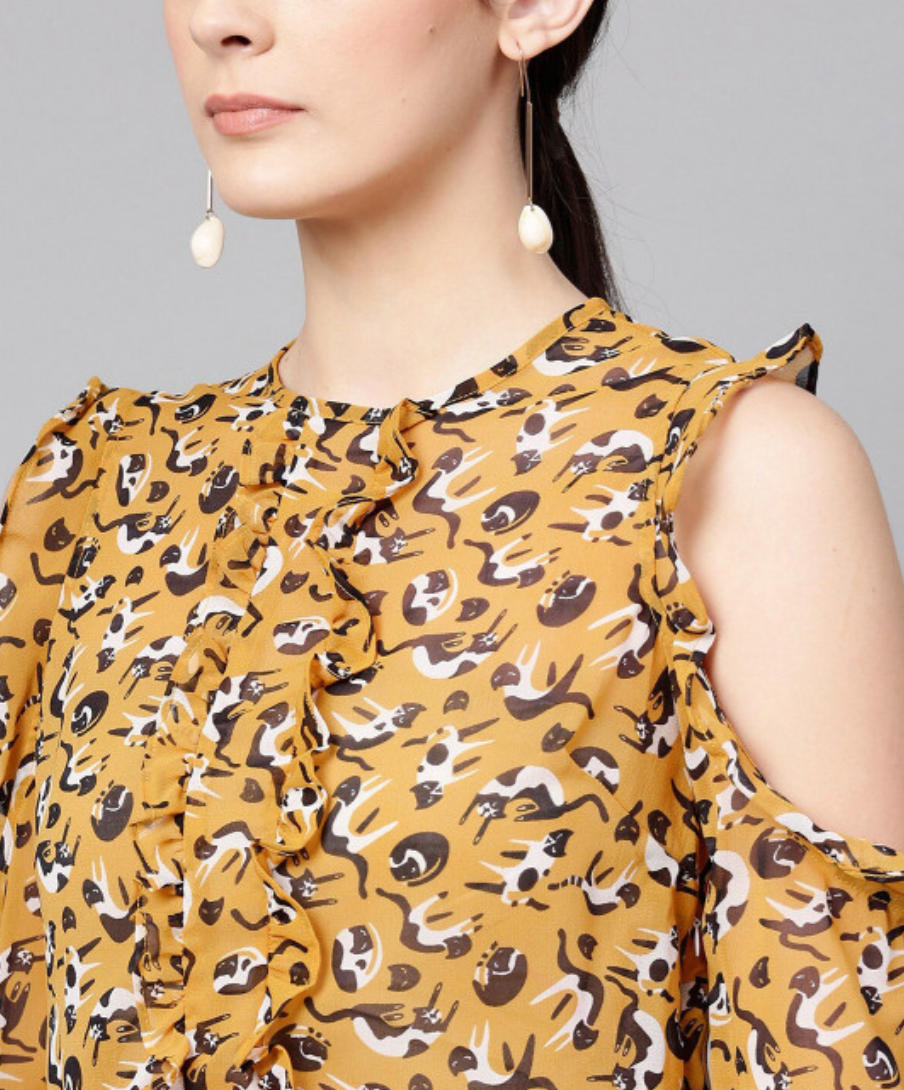 Brown regular top, Floral print, Round neck, three-quarter, cold-shoulder sleeves, Ruffles detail, Woven