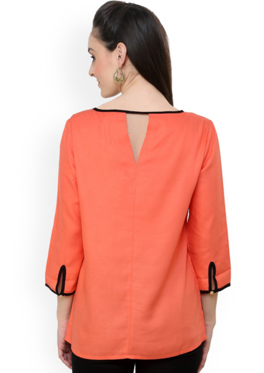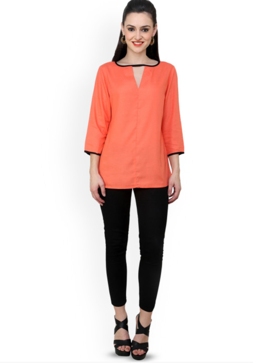 Coral solid woven regular top, has a round neck, three quarter sleeves