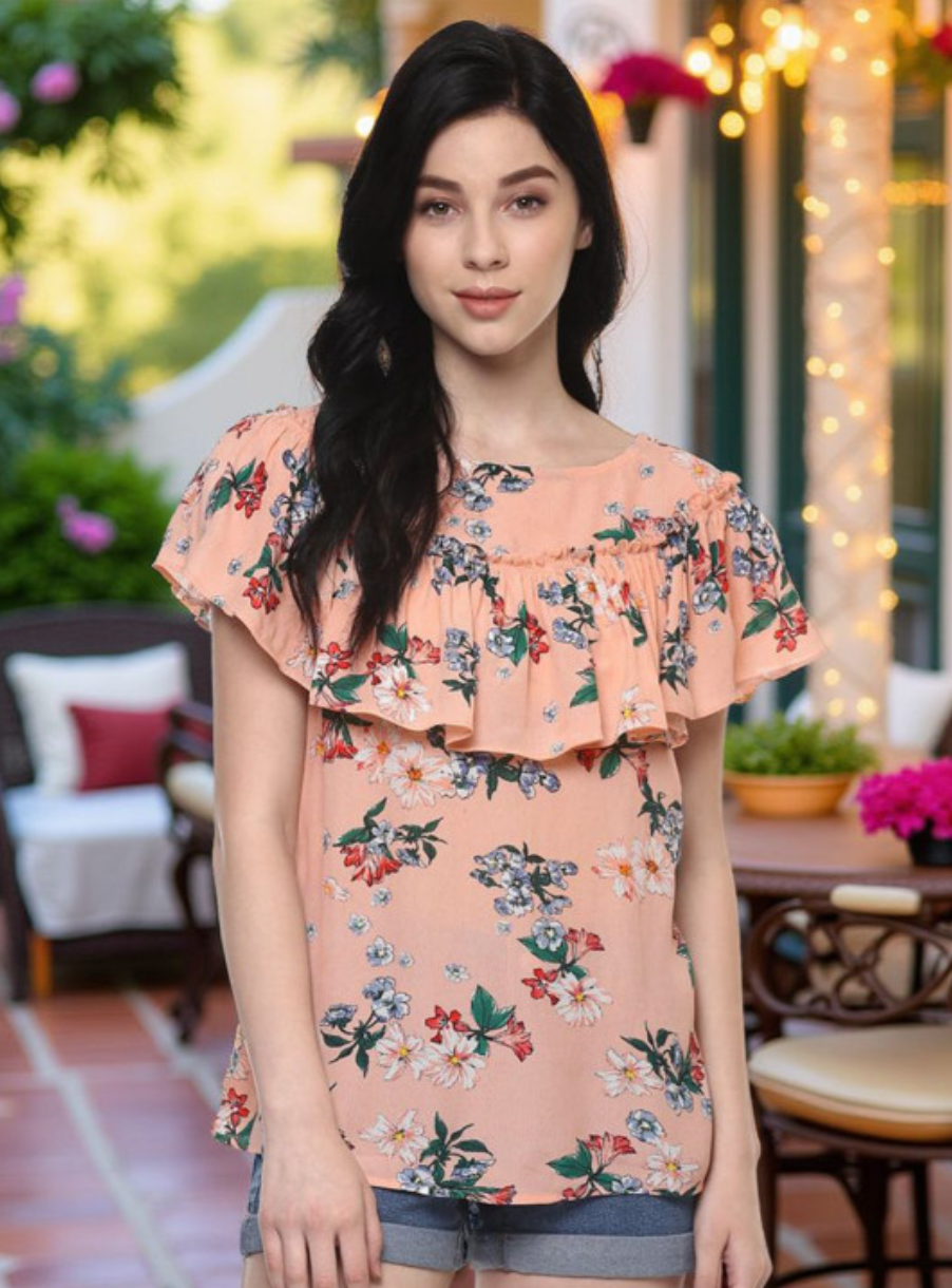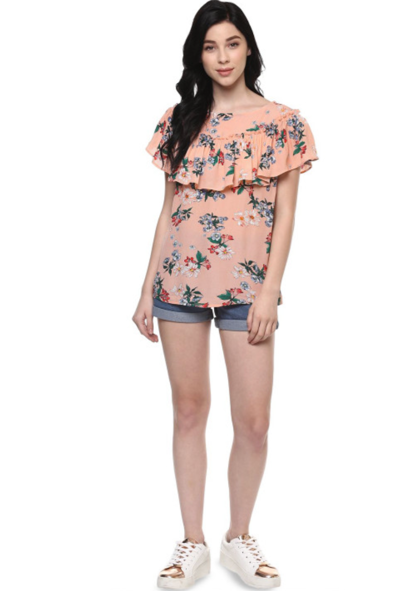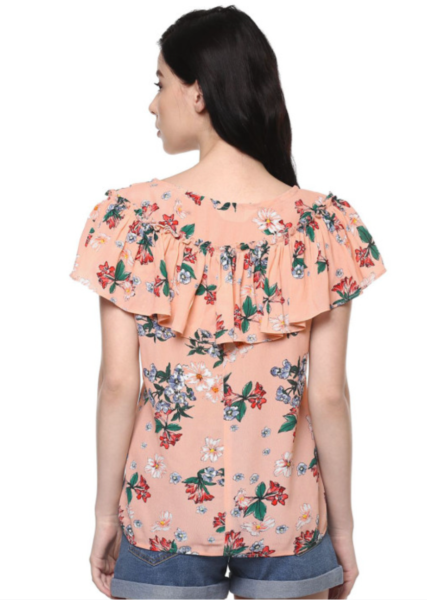 Peach-coloured and blue regular top, Floral print, Round neck, long, flutter sleeve, Ruffles detail, Woven crepe