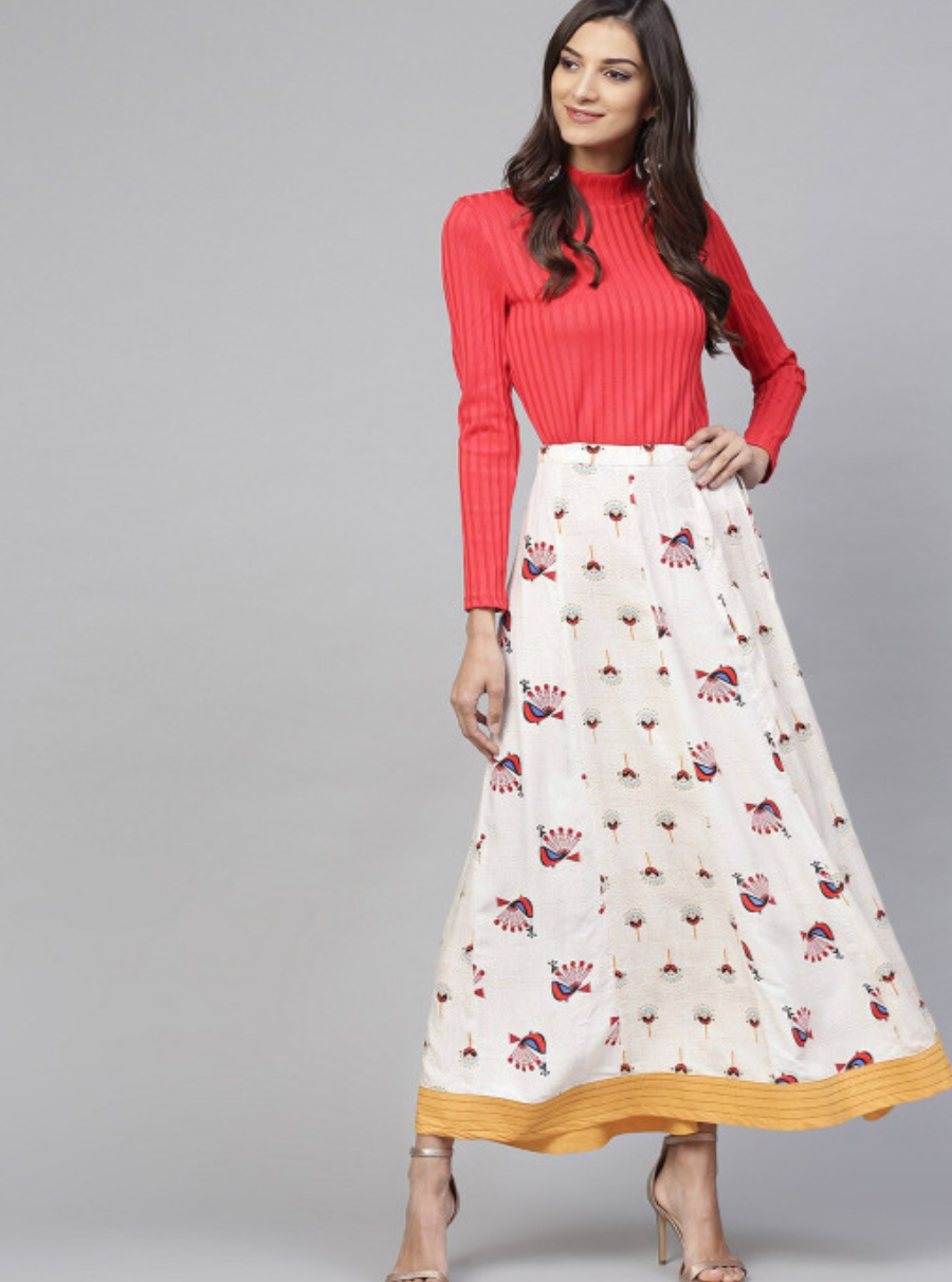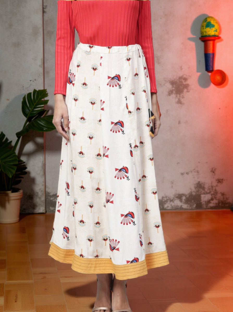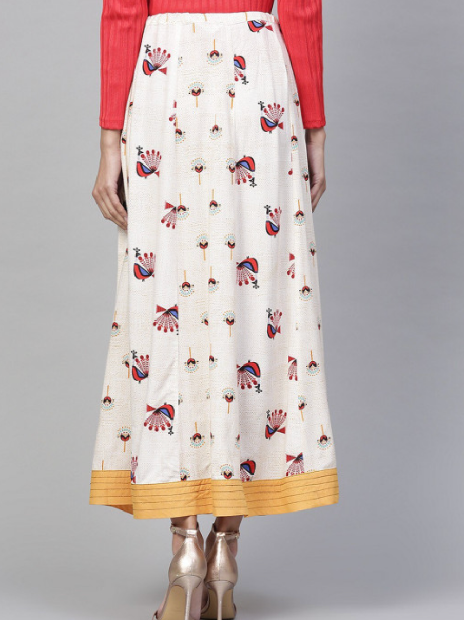 Off white peacock printed maxi flared skirt, has an elasticated waistband with drawstring and flared hem
