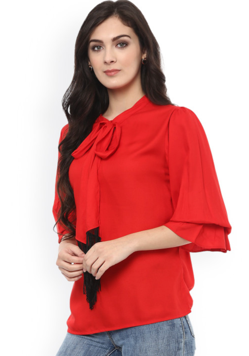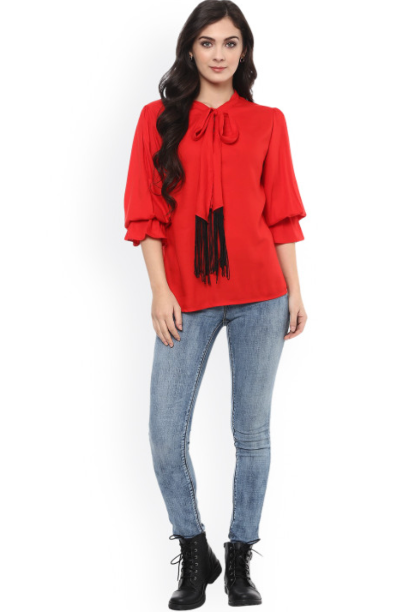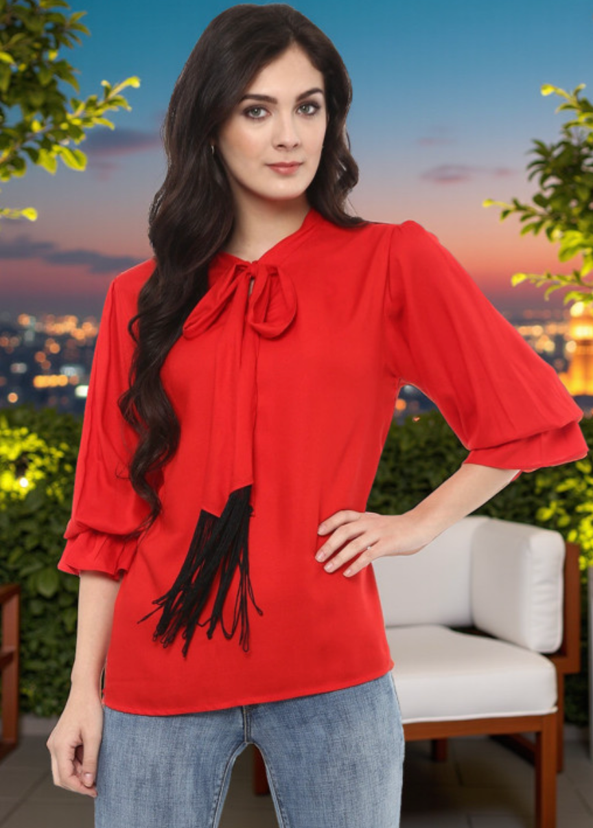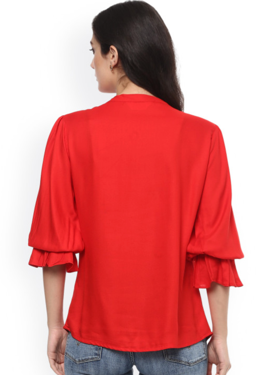 Red solid woven regular top, has a round neck, three-quarter sleeves